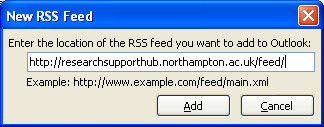 Before you can subscribe to a feed, you need to know where it can be found. In future posts I’ll take a look at more advanced subscription methods (Outlook’s is a little archaic and atypical), but for our purposes you just need to know that the address for the Research Support hub RSS feed is: