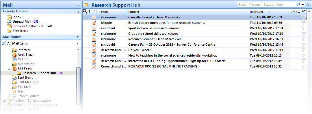 You’ll now see a folder inside RSS Feeds named Research Support Hub, and if you click on it you’ll see a list of our recent posts, looking very much like emails: