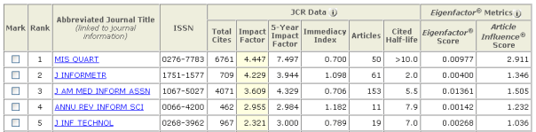 The JCR report lists a number of metrics for each journal, among them each journal’s total citations, one and five year impact factors, an immediacy index and Eigenfactor. These and more are described in Thomson Reuters’ JCR Quick Reference Card and Fact Sheet.