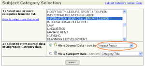 If you choose to view a group of journals, you may then select one or more subject categories for your report, and choose whether to view the data by journal or category. The default view is of journal data sorted by journal title; if you wish to see the highest impact journal in a subject area then you should change the ‘sort by’ field to impact factor as shown above. Click on the Submit button to generate the report.