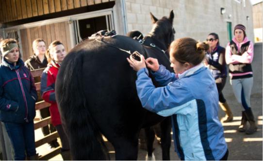 Dr Anna Walker applying the sensor system to “Dermot” while the third year Equine Degree students watch and get involved.