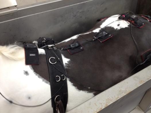 This sophisticated piece of equipment is supplied by Xsens – a Netherlands based company. The system consists of eight tri-axial inertial sensors wired to a controller (Xbus Master). Each sensor is applied to anatomical landmarks on the horse’s axial skeleton. A wireless signal is then sent from the controller to a nearby laptop where the biomechanics of the horses’ movement can be recorded and processed. This system is being used to objectively compare horses’ locomotion overground with that on the equine aqua-treadmill at different depths of water in both walk and trot.