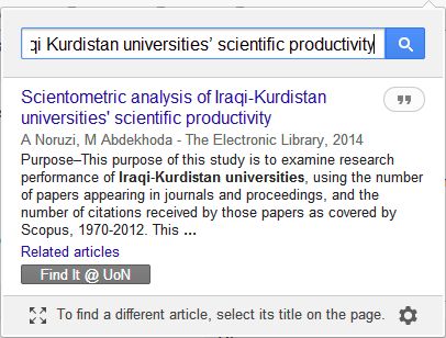 Depending on your Scholar preferences and the journal details, you may see a Find It @ UoN button, which will take you to the library’s Find My Reference service to locate a full-text copy of the article. Here’s an example: